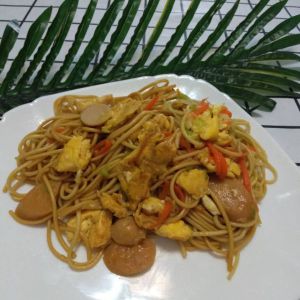 将煮好的面条下入锅中和蔬菜一起翻炒,然后倒入调好的料汁,翻炒均匀即可出锅