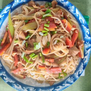 菜炒熟后,把准备好的面放入锅内,边翻炒边用铲子把面往小段压一下,炒香后就可以出锅啦,出锅装盘后撒几粒葱花就可以吃啦。