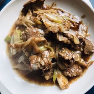 锅中倒入油,放姜丝炒后倒入羊肉爆炒,肉变色后加入汁料。