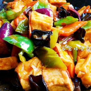 选择北豆腐,冷水浸泡一小时,切小块,煎至金黄成型,葱蒜备用