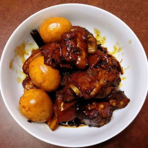 成品。颜色红亮,排骨香而不柴,肉皮软烂,酱鸡蛋也好吃。