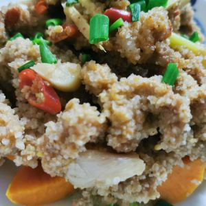 腌好后加入适量蒸肉米粉,喜欢吃米粉的可以多加一些,拌匀,装盘~