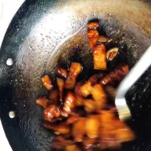 加入冰糖料酒红烧汁老抽少许盐翻炒均匀。生姜蒜子八角花椒一并放入。炒到颜色鲜艳香味出来