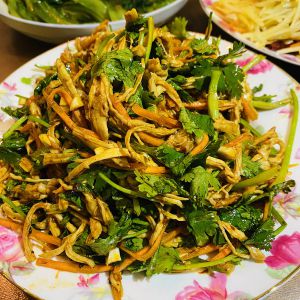 把香菜和胡萝卜丝拌好放在最下面,鸡丝放在菜上面,然后切半头蒜的蒜末,放在鸡丝上,撒一层粗辣椒粉。把调味汁倒进鸡丝和菜上。
