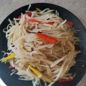 土豆擦细丝用水泡一会,炒之前再用清水冲几遍