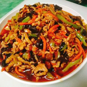 起锅烧油,油八成热放郫县豆瓣酱炒香,放肉丝,炒变色放葱花,胡萝卜丝木耳丝,炒半分钟左右,放入调好的汁,翻炒均匀,粘稠后放入辣椒丝,蒜片,炒半分钟就可以出锅了。
