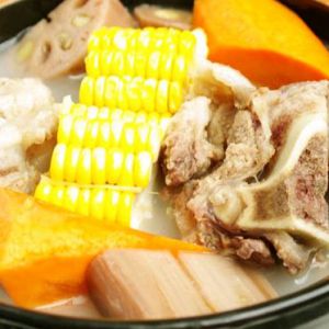 放入藕、胡萝卜和玉米,大火煮开改小火慢炖1小时。