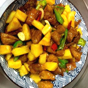 我们先搞一个调料水淀粉、番茄酱两勺味精一点生抽一勺白糖两勺醋两勺,肉我们炸定型一下,在炸第二次的时候要炸的有点微黄就可以起锅炒姜葱蒜青椒、放勾芡汁、放菠萝和肉翻炒一下收汁起锅