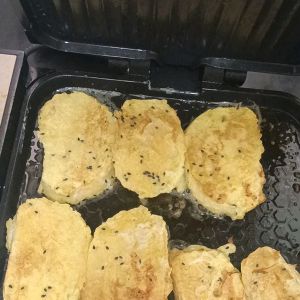 四个鸡蛋加适量食盐,黑芝麻打散备用。在准备材料的时候,可以先将电饼铛通电加热。