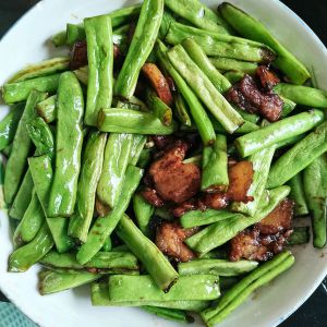 4、加入切好的大蒜炒出香味后,直接把四季豆倒进锅中,开大火翻炒至断生,而后转小火加入盐,耗油,鸡精,老抽,再转大火翻炒3分钟(炒熟)左右即可