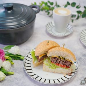 将牛肉饼静置1-2分钟,汁水会更加丰富,此时将汉堡胚入烤箱烤2分钟