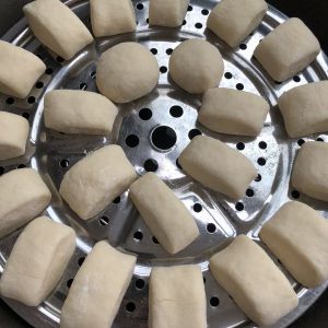 切成小段,我宝宝吃的,所以尽量切小块,再放锅里再发30分钟,然后冷水上锅蒸10分钟,我这切的比较小,所以时间会短些,如果大的要蒸20分左右,关火,不要打开盖,再焖5分钟,这样出来的馒头就不会塌塌的,成品也好看