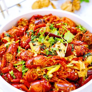 小龙虾剪去虾头,拉出虾线,油炸30秒捞出。