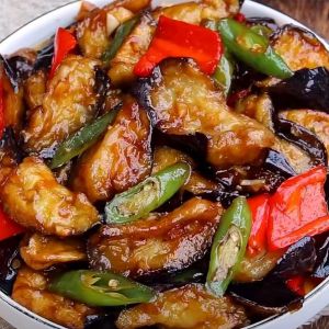 锅里倒少许油,放入姜蒜,炒香放辣椒,翻炒一下,倒入前面煎好的肉,炒一会儿倒入,前面半熟的茄子块