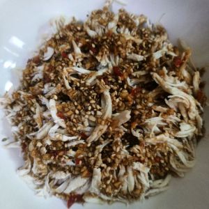 鸡胸冷水浸泡半小时后,冷水入锅煮熟,用凉白开和冰块浸凉,放在板子上用擀面杖压出扁,按照鸡胸肉纹理手撕碎摆入盘中,淋上料汁放入冰箱备用即可。
