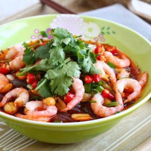 再放入花生、榨菜、北极虾、香葱、小米辣和香菜