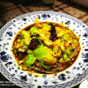 快速倒入沥干水的手撕包菜,猛火快炒三十秒,期间迅速加入黄酒,味极鲜酱油,蚝油镇江香醋后快速翻动。感觉包菜颜色变了七成就赶紧关火。