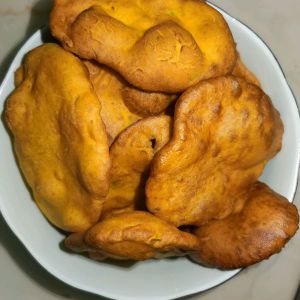 捣碎的南瓜泥 加入一碗白面,五克白糖,一小勺小苏打,两个鸡蛋,搅拌成面絮状。