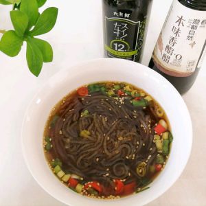 碗中放入小葱辣椒碎,加入醋和轻盐酱油