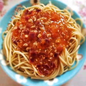 肉沫翻炒熟之后,放入西红柿丁翻炒出汁,在倒一小碗水,加番茄酱、盐、糖,煮十来分钟即可。