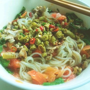 加入牛肉一起煮,煮好后装盘,摆造型,可以烫菜叶,调料事先加在碗里的,有酱油,醋,盐,油,葱。装饰的时候加了酸豆角,花生。