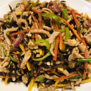 配菜炒好,放入肉丝和料汁翻炒均匀,出锅