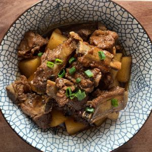 爆香后放入排骨、冰糖大火煸炒10分钟左右,中途加入料酒、生抽、老抽、盐