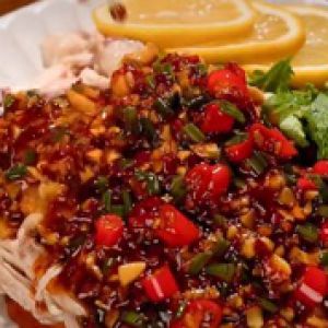 鸡腿撕成条,放柠檬 香菜,加入料汁抓匀即可。