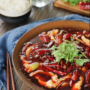 9、锅中放油烧至约180度淋入碗中,最后放上少许香菜,水煮鱼完成!