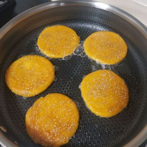 最后就是将成型的南瓜饼煎至两面金黄,上碟
