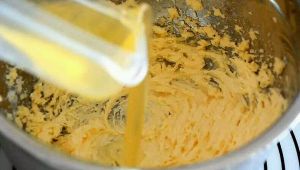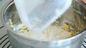 将130克室温软化的黄油倒入打蛋盆中,再加入35克细砂糖,65克糖粉,打发至白,分三次加入蛋液打匀。