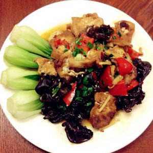 依次放入生姜、木耳、红椒,跟豆腐一起煸炒,放入适量盐,让菜入味