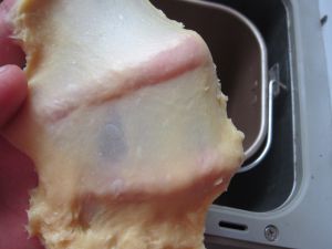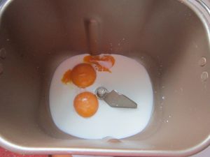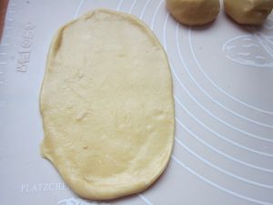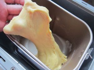 面包桶内依次加入:蛋黄、牛奶、面粉、盐、白糖、奶粉。选择15分的柔面程序。揉面结束后盖上湿布静置一小时。
