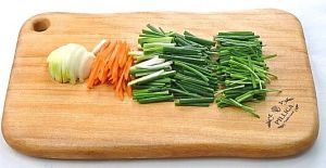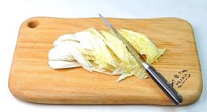 将半棵白菜用手将其分成一张一张叠加(便于用到切的工整)并用到斜45度角切开!初学者要注意手不要被刀切刀哦