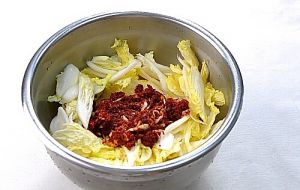 将切好的白菜放入空盆内并依次倒入2/3本粗盐和200ml水后浸泡40分钟~1小时左右。