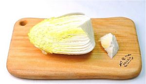 将一棵大白菜一分为二取之一半量,并用刀将其尾部切掉。