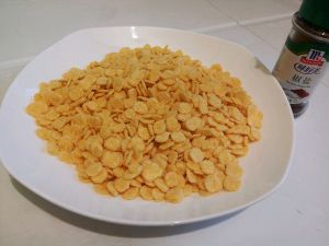 炒到感觉玉米片变轻或者拿一个吃一下,感觉脆脆的,咬进去没有硬心就可以撒椒盐出锅了
