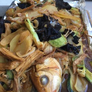 鱼放入烤箱210度烤20分钟拿出来,放上炒好的配菜再放回烤箱