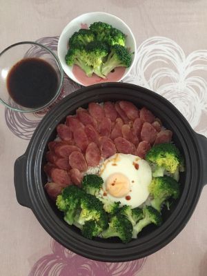 腊肠和西兰花都美美哒铺在饭上。调味酱看个人口味,酱油,糖混合,当然,如果弄点蒜蓉更佳香。
