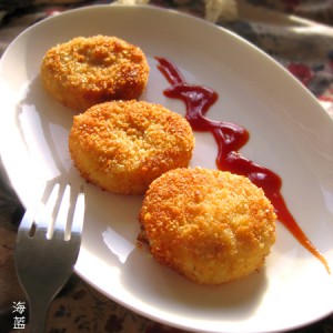 将备用的小饼依序先沾裹上面粉,再沾裹蛋液,最后裹上面包屑。