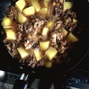 待沸腾后,加入三块冰糖,稍后,放入土豆,小火慢炖。