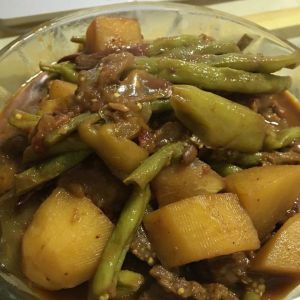 油先烧热,放入八角,葱,蒜,胡椒面。然后放肉炒,肉炒的差不多先放豆角,炒2分钟。