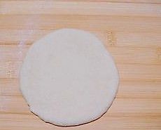 案板上撒手粉,将松弛好的面团压平,擀成圆形。