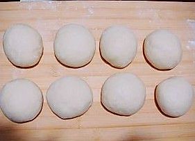 把所有原料(除黄油外)揉成面团,我用的是面包机和面程序,15分钟后加入黄油,将面团揉到出筋膜后进行基础发酵。发酵至2。5倍大时,分成8份,揉圆松驰15分钟。