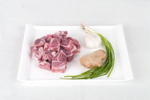 切配:大蒜剥皮、切成蒜泥,姜切细丝,香葱切段;肋排剁成2-3厘米见方的小块,清水冲洗干净、沥干,放入大盆中。