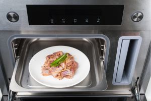 预热:取出蒸箱中的无孔蒸盘,水箱加满水,再关门、通电、开机,选择“蒸肉”模式,设置100℃,定时30分钟,按确认键,蒸箱开始预热。