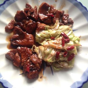 把肉倒进去,待肉稍微变白,加一点水,倒点酱油,,稍微加点醋,翻一翻肉,2分钟后,加入水,漫过肉,小火闷个20分钟,开锅,加点糖,看见颜色不够再加点酱油,倒入头菜 [ 头菜要手撕成大片 ] ,待一分钟。