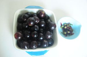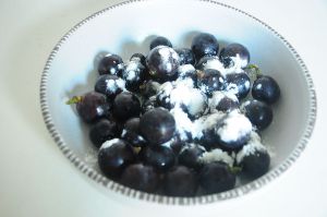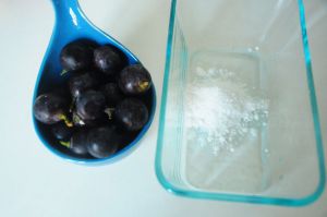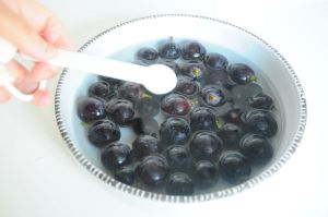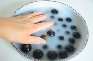 晾水时准备清洗黑加仑,黑加仑连着一点根用剪刀剪下,放入2汤匙淀粉或面粉