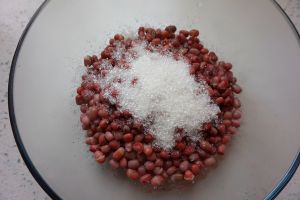 煮熟的豆子趁热用筛子滤水,装入容器,加入适量的白糖。
