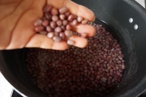 泡好的红豆控干水。